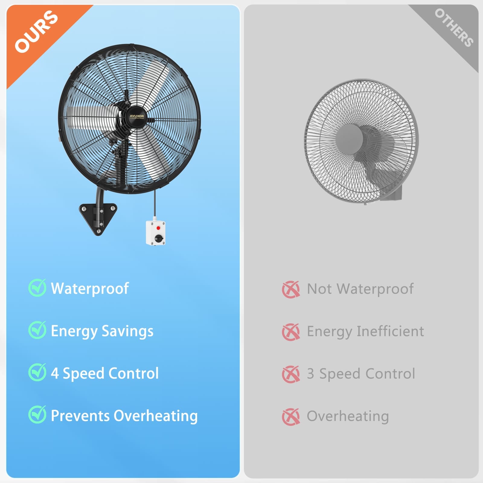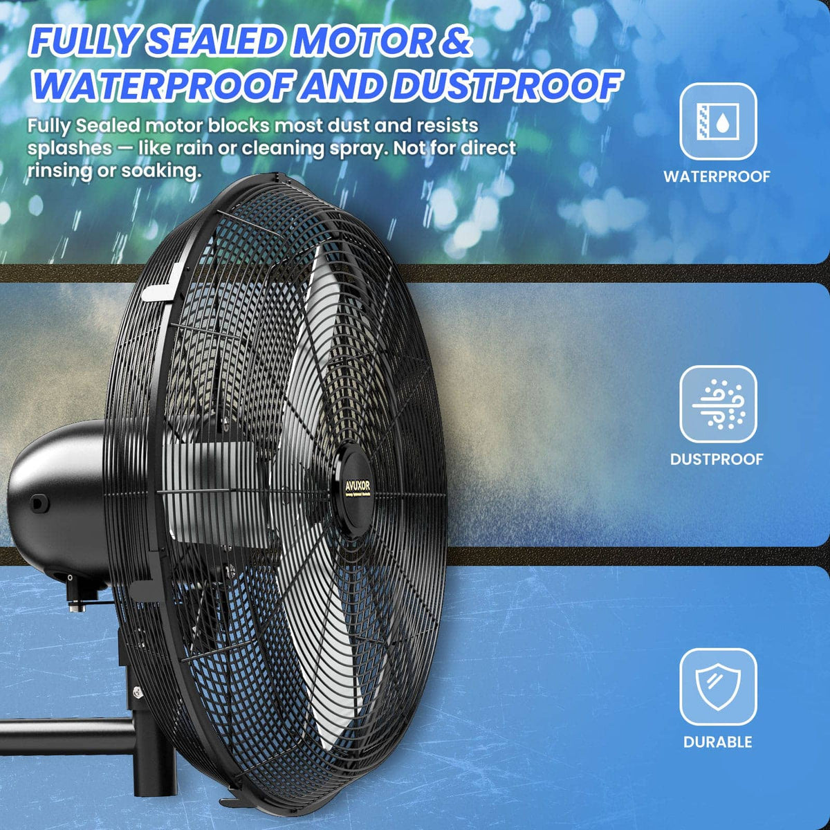 AVUXOR Outdoor Wall Mount Fan, 4 Speed Oscillating Wall Fan with All Sealed Brushless DC Motor, Heavy Duty Industrial Fans, Waterproof Fans
